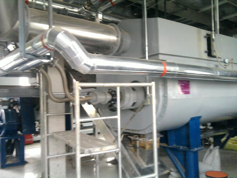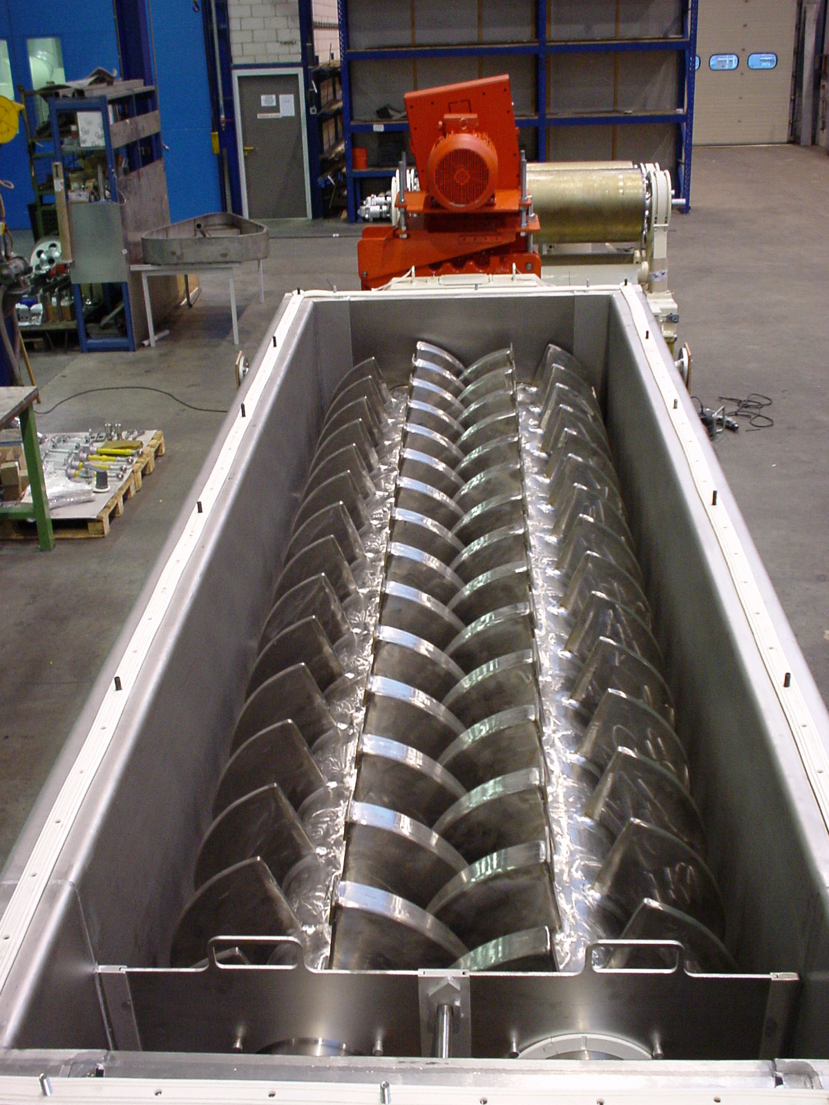 槳葉式干燥器是一種在設(shè)備內(nèi)部設(shè)置攪拌槳,使?jié)裎锟圃跇~的攪動(dòng)下,與熱載體以及熱表面充分接觸,從而達(dá)到干燥目的的低速攪拌干燥器。結(jié)構(gòu)形式一般為臥式,雙軸或四軸。槳葉式干燥器分為熱風(fēng)式和傳導(dǎo)式。熱風(fēng)式即通過熱載體(如熱空氣)與被干燥的物料相互接觸并進(jìn)行干燥,在傳導(dǎo)式中熱載體并不與被干燥的物料直接接觸,而是熱表面與物料相互接觸。傳導(dǎo)式的優(yōu)點(diǎn)是物料不易被污染,排氣量小,熱效率高,體積相對(duì)小,有利于節(jié)約能源及防止空氣污染。